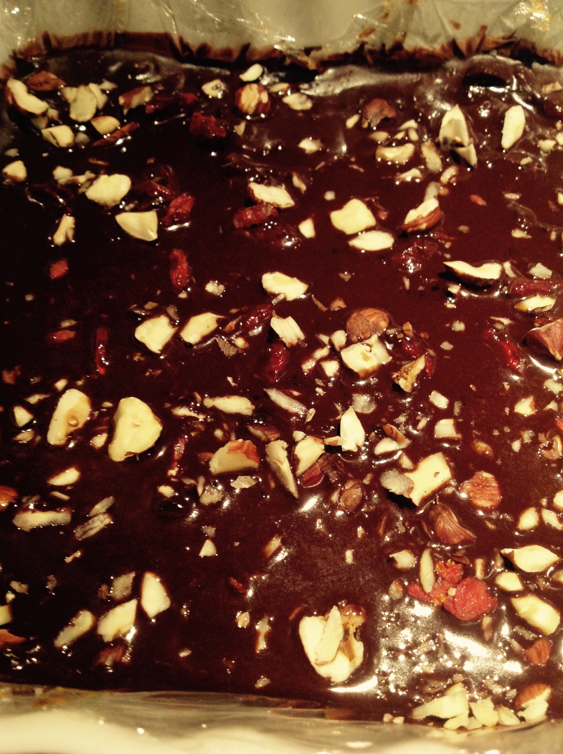 Za treći čokoladni sloj u manjoj posudici uspite 2 supene kašike kokosovog ulja - najbolje extra djevičanskog, 2 supene kasike sirovog kakaa u prahu I 1 supenu kašiku meda ili javorovog sirupa ili agave. Sve dobro izmiješajte brzo ručnom pjenjačom ili viljuškom I prelijte preko kao treći sloj. Odmah, dok je još svježe pospite nasjeckanim lješnjacima i stavite u zamrzivač još najmanje 2 h ili preko noći.